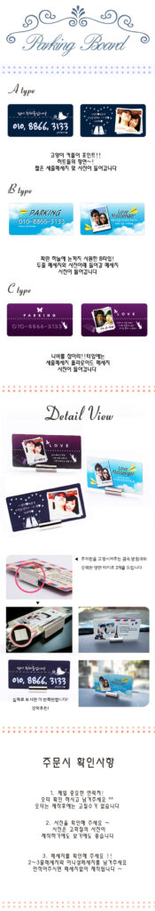 단면과 달리 뒤쪽에 사진과 메시지를 함께 넣어 연출하는 양면형 주차번호판입니다. 주차 안내와 개성 있는 연출을 동시에 원하는 분께 알맞습니다.